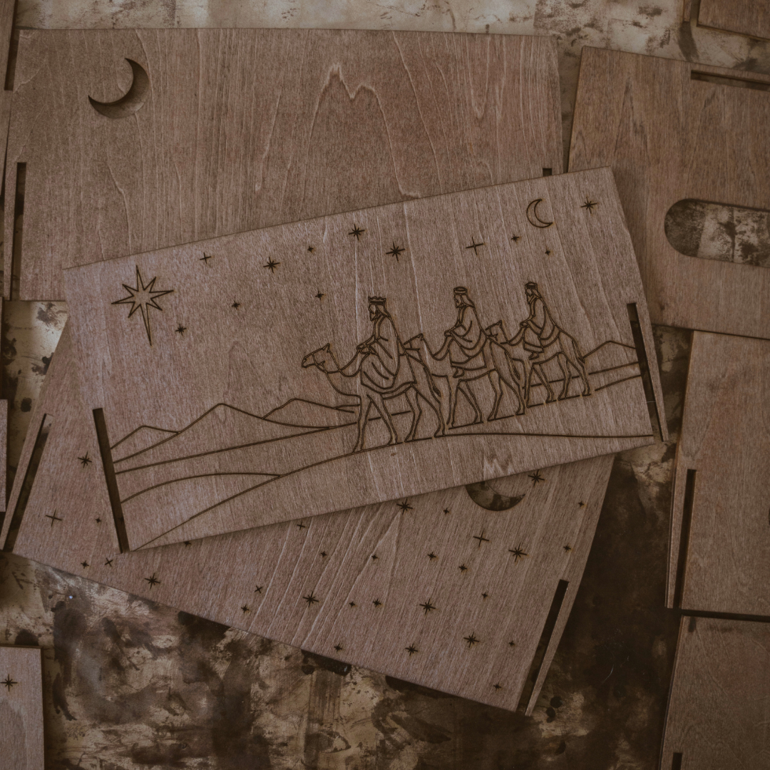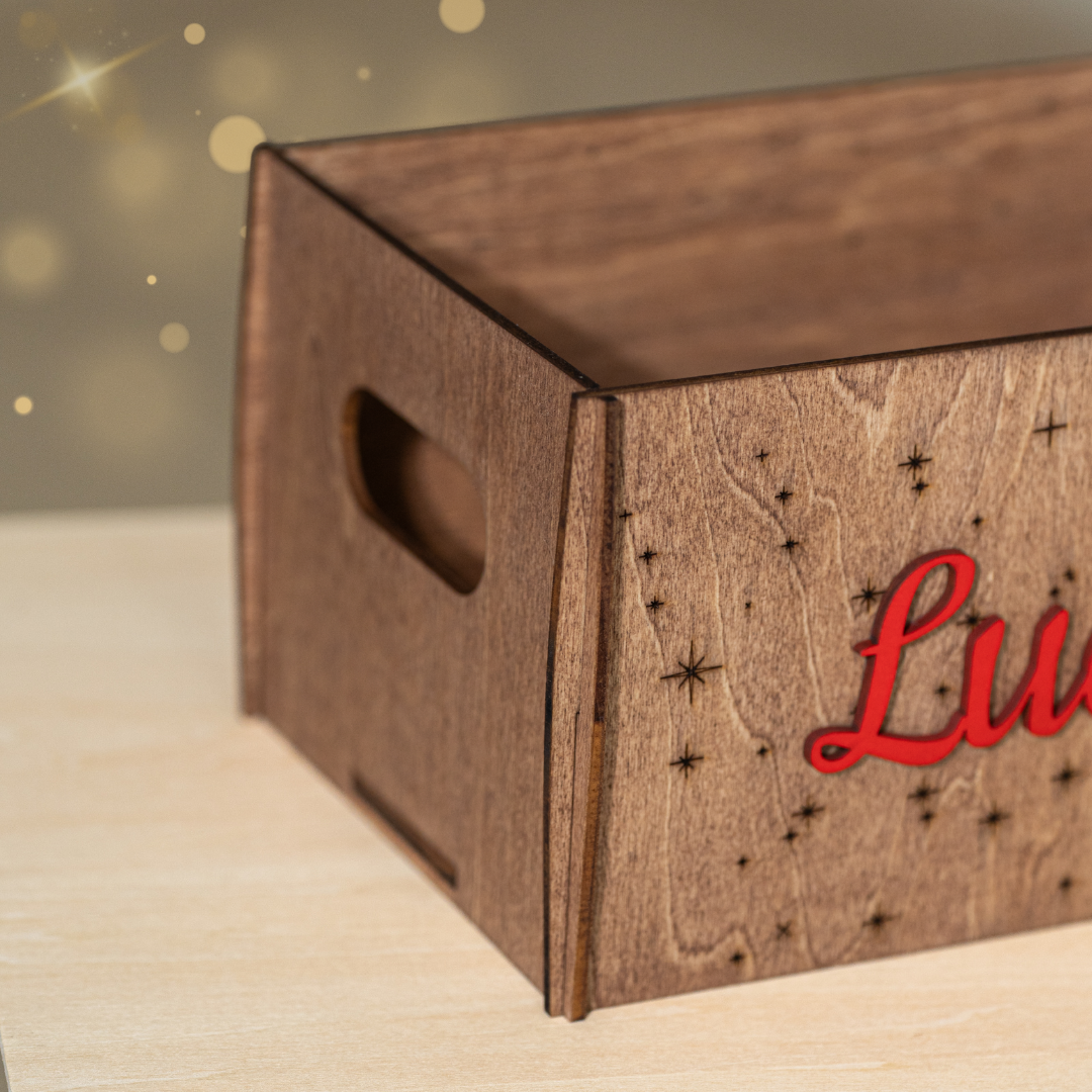 Incluye el nombre en relieve pintado en color rojo, creando un detalle único y especial que los niños recordarán cada año. Cada pieza se corta y graba con láser en nuestro taller, cuidando cada detalle para que tu caja sea tan especial como la noche de Reyes. 🌙🎁